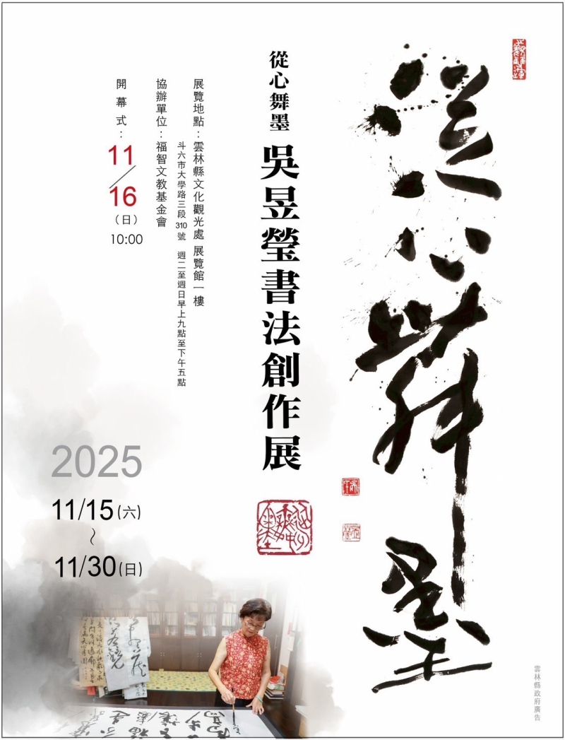 從心舞墨吳昱瑩書法創作展11月15日至30日在雲林文觀處展覽館一樓展出16日上午10時舉行開幕式屆時歡迎鄉親共襄盛舉。