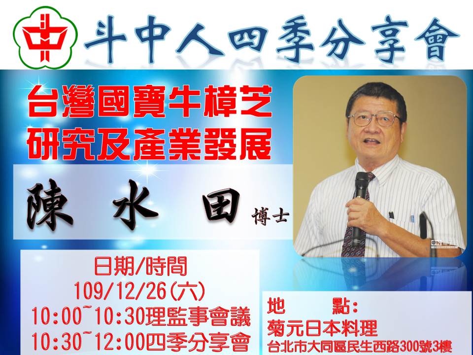 2020.12.26斗中人四季分享會第十八場『台灣國寶年樟芝研究及產業發展』,假台北市民生西路300號3樓 ...